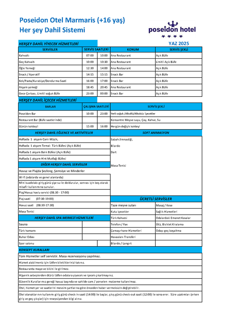 Poseidon Hotel, tatilden bekleyeceğiniz her türlü konforu, açık ve kapalı yüzme havuzları, vücudunuzu bakımlara hazırlayan buhar banyosu ve sauna alanları, geleneksel Türk Hamamı ve kişisel bakımlar ile konuklarına hayallerinin tesisini sunuyor.