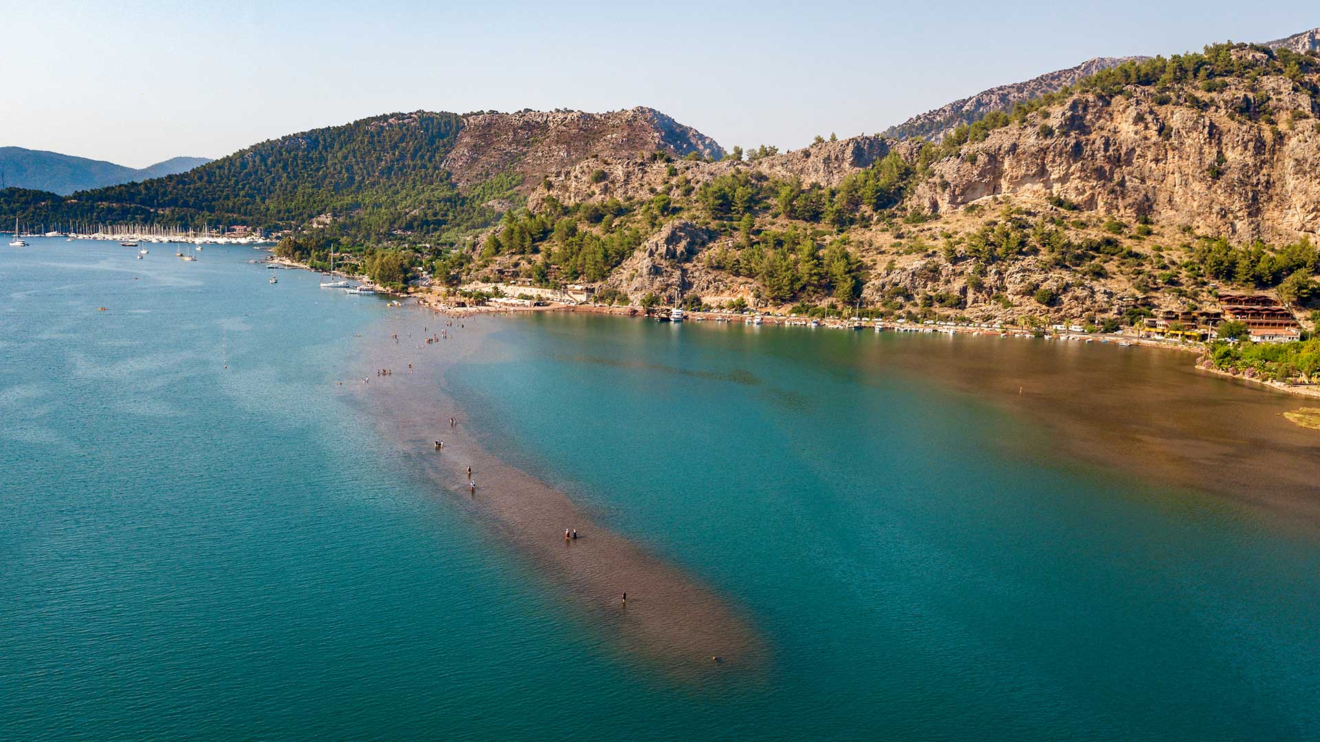 Orhaniye Koyu içinde kırmızı ve iri taneli kumlardan oluşan bir set, kıyıdan itibaren denizin açıklarına doğru dil gibi uzanıyor. Gel-git olaylarında bir görünüp bir kaybolan bu kum set sular yükselse de yöreye gelen turistlerin su içinde bile yürümelerine olanak tanıyor.